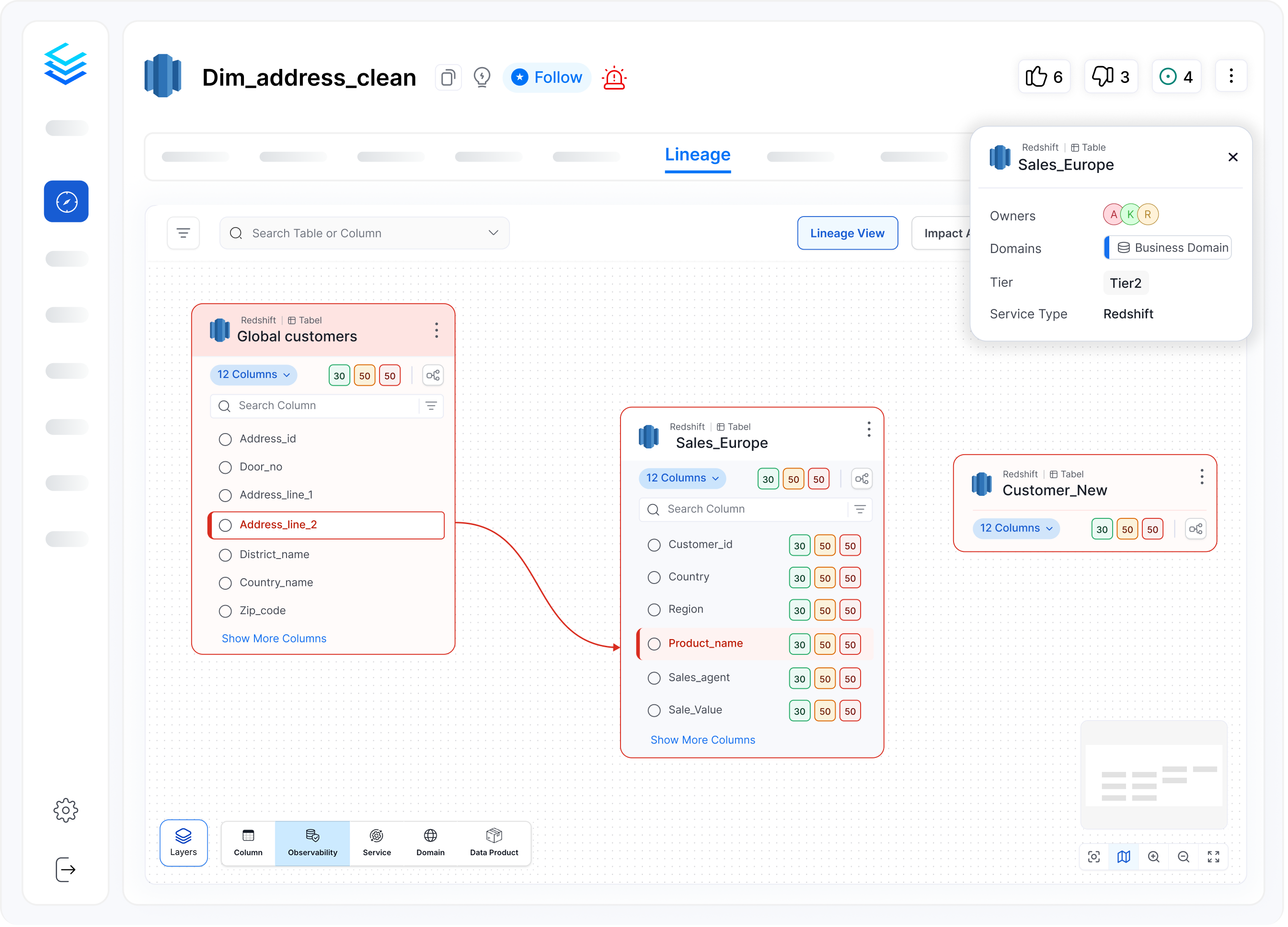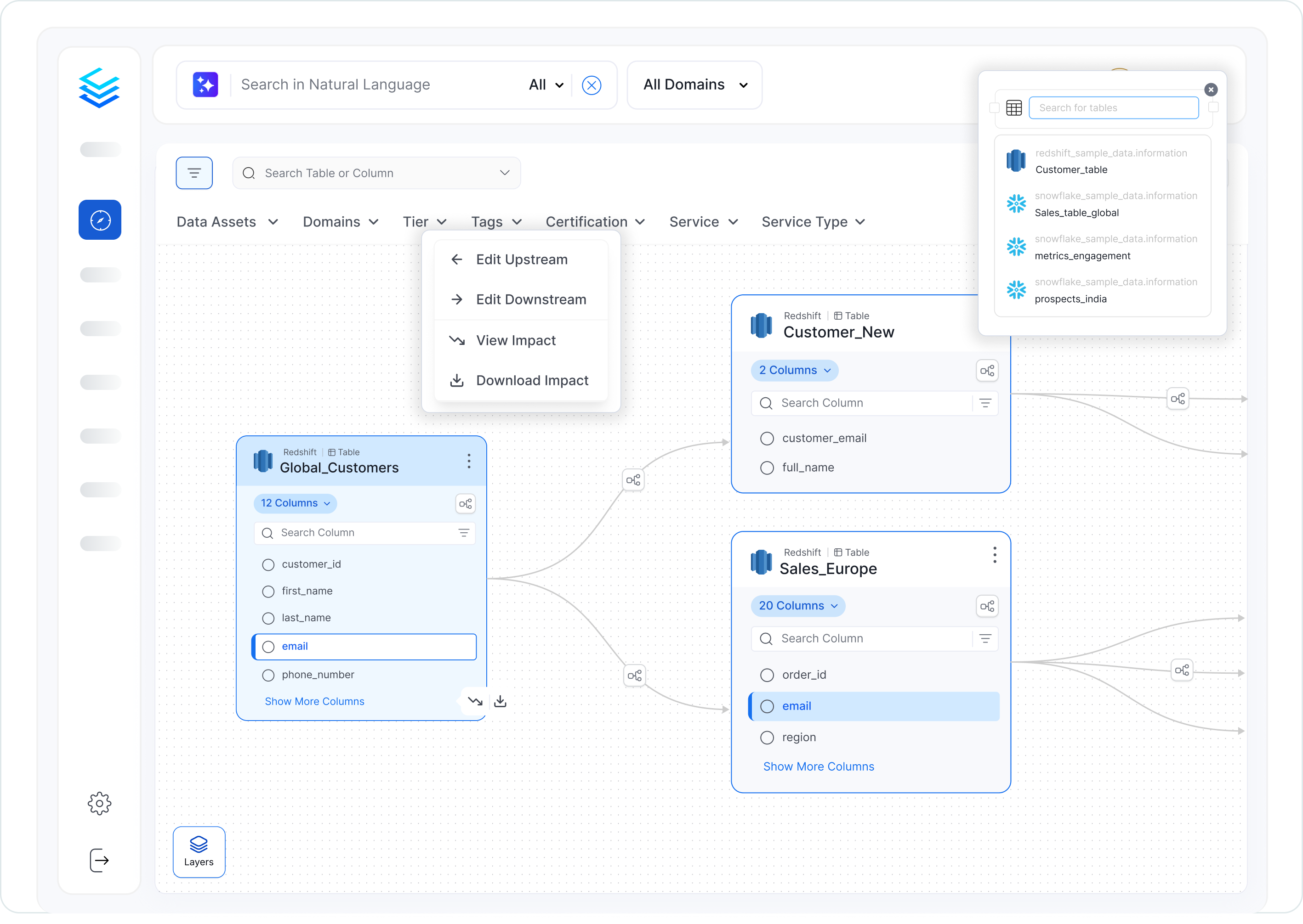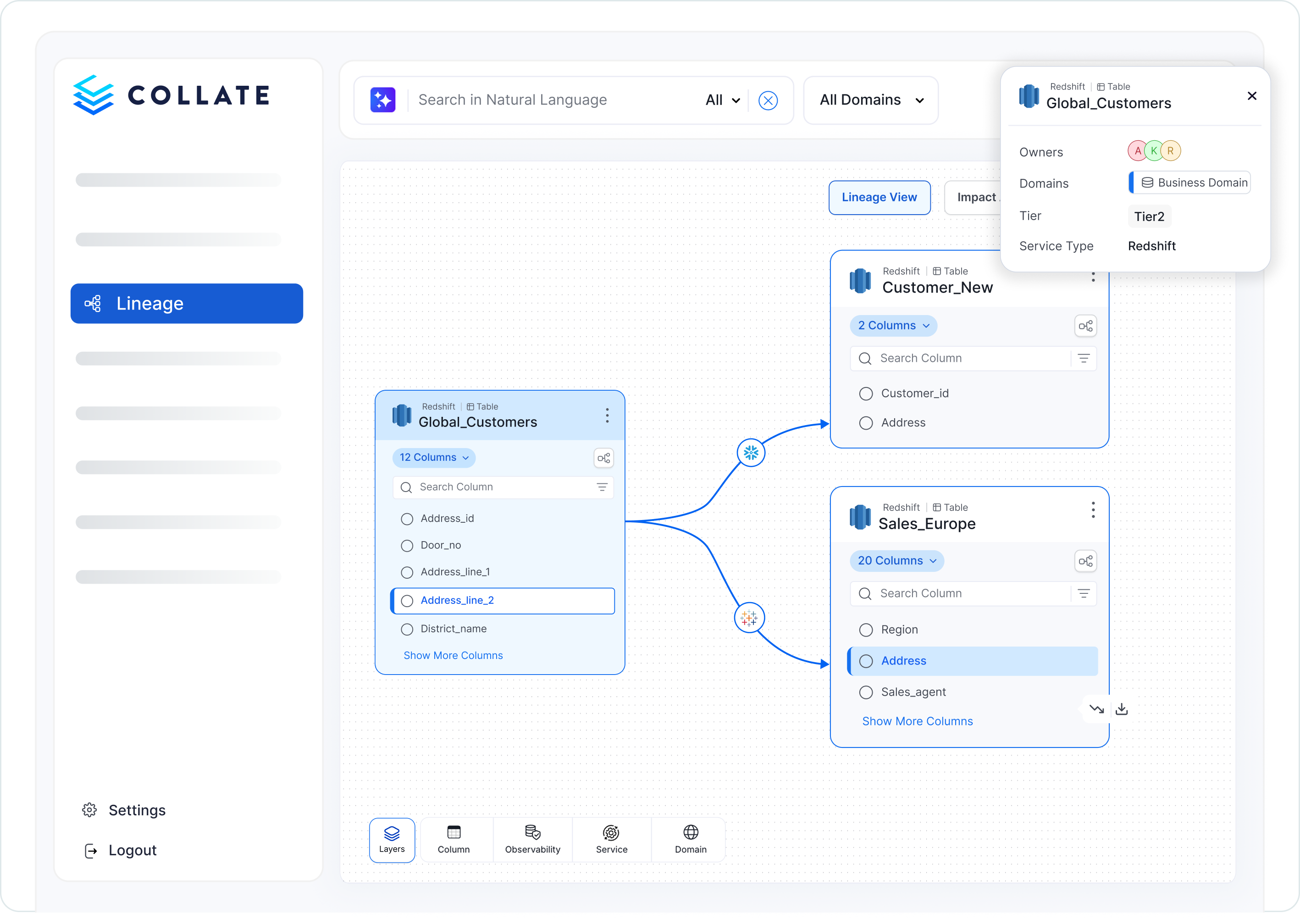 Collate data lineage captures more sources (via over 100 native connectors), more asset types (including pipelines and dashboards), multiple levels of lineage (including column level and domain level), and the comprehensive metadata exposed in the lineage graph. Since you get data lineage as part of the Collate Semantic Intelligence Platform, a big advantage is you get the critical data management capabilities you need all in one place. There is no need to stitch together multiple single-purpose solutions that have limited information or leave visibility gaps in your data landscape.